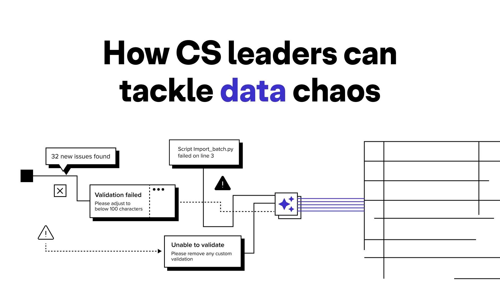 CS leaders know that any software application that requires data ingestion comes with a serious challenge to user satisfaction: Customer onboarding. Successfully navigating the onboarding process is critical for ensuring a positive first impression, and glitches and delays from poor onboarding can derail a new relationship before it's even begun.