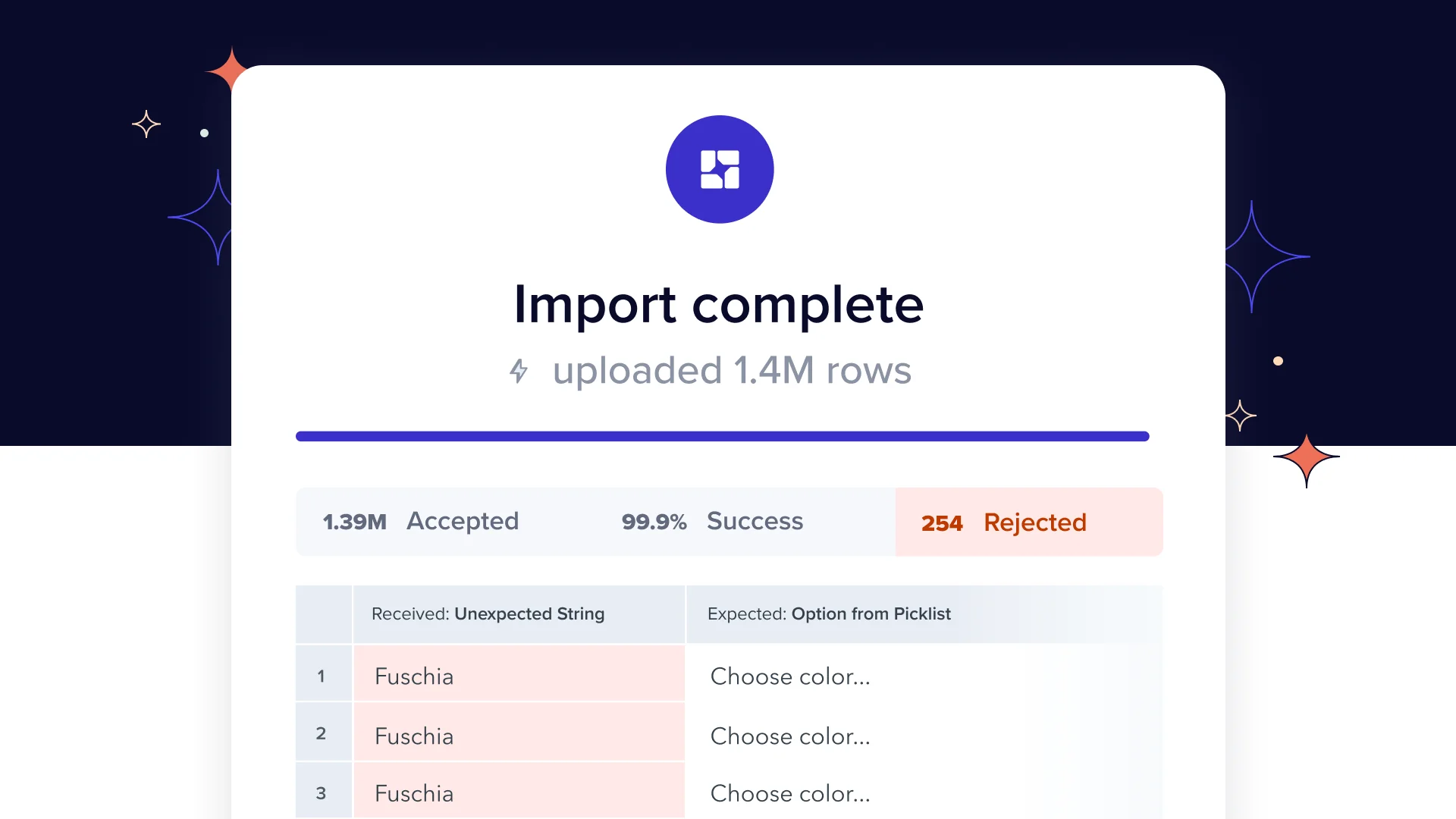 Crystal clear acceptance states Flatfile makes it clear what data is ready to go, what needs their attention, and how to resolve anything that might keep them from importing their data into your system. Rejections can now be passed directly from your system!