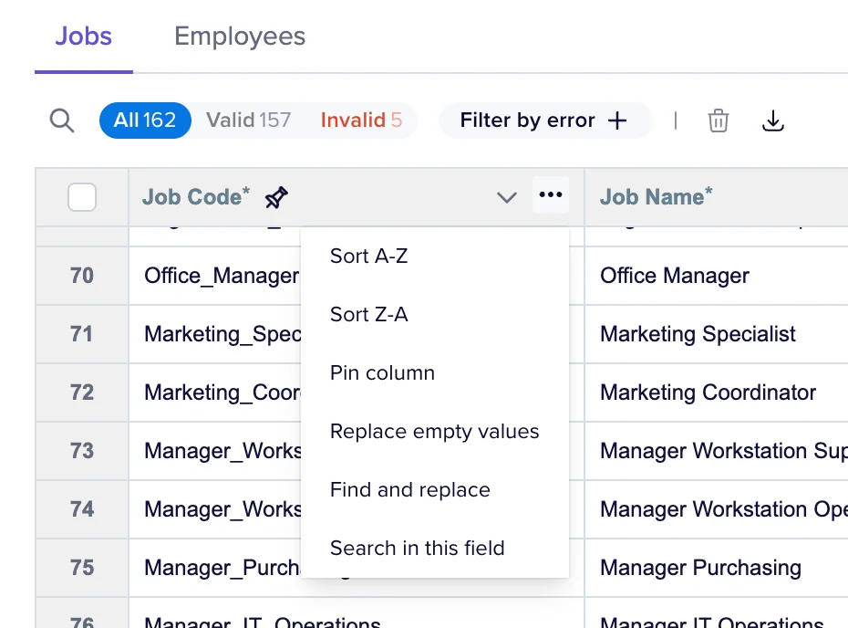 Flatfile also makes it easy for end users to find and optionally update data with built-in options for "search," "find and replace," and "Replace empty values," making it easy to find what you're looking for.