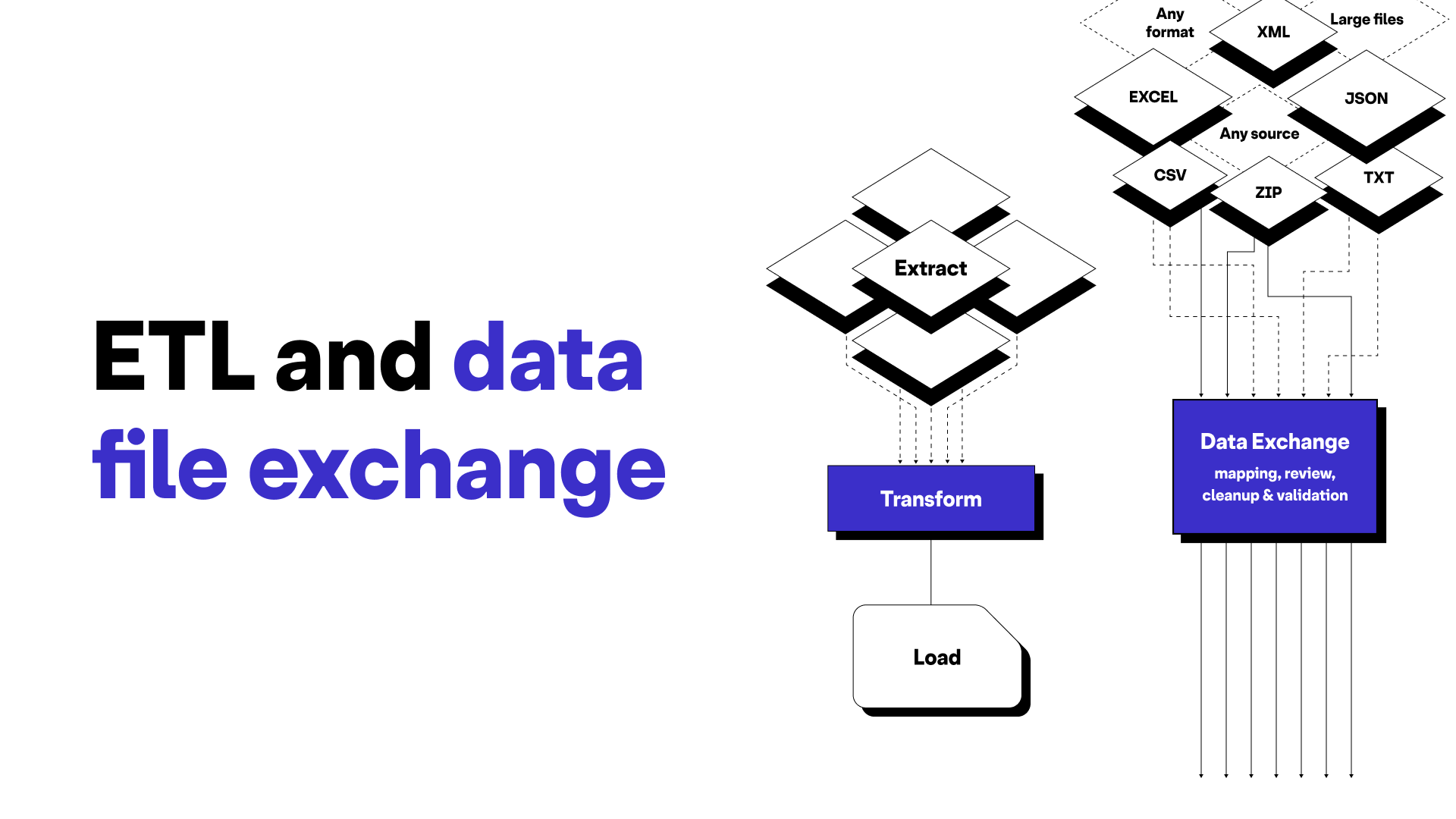 Intelligent and scalable data cleaning and validation: Data exchange tools can handle large volumes of data that might otherwise require a lot of time and manual effort to clean, validate and process. This supports a much more timely and efficient flow of data in parallel to other data streams that are managed with ETL tools.