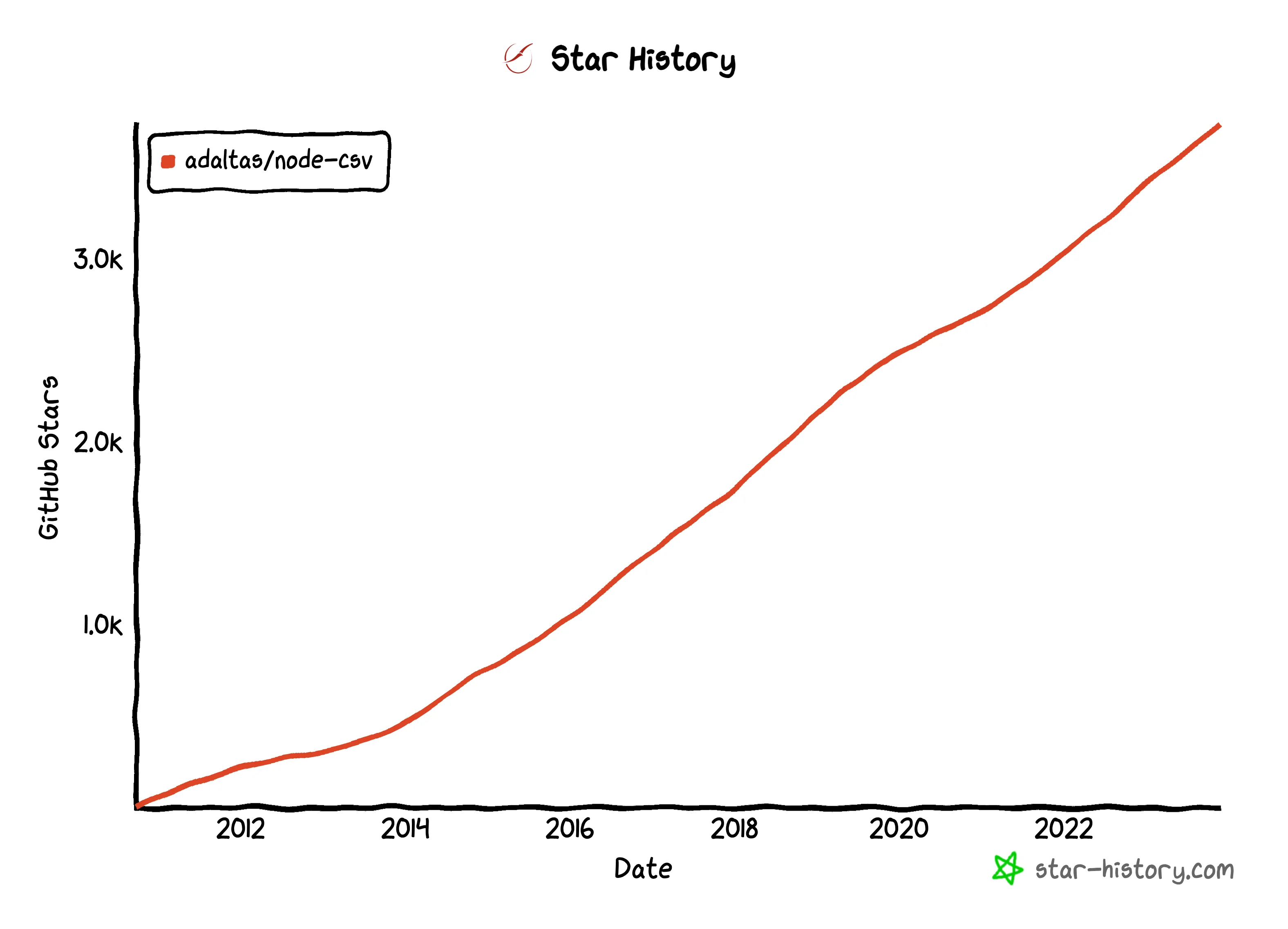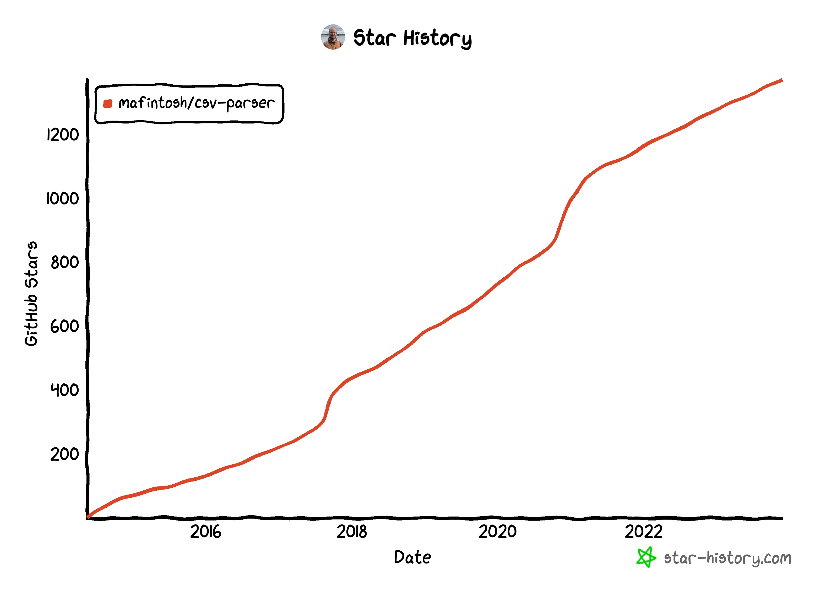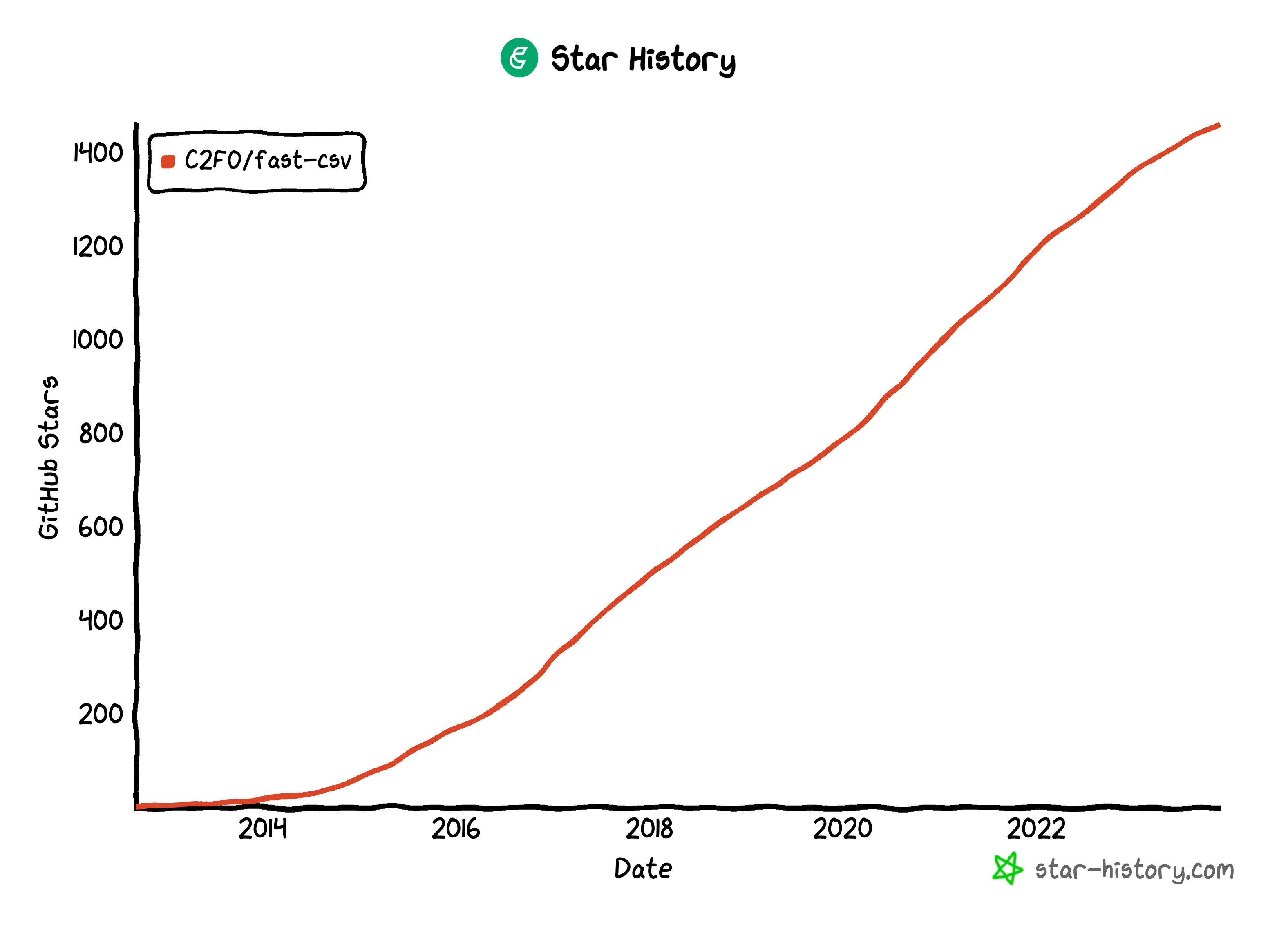 This CSV parser comes to us as the result of a C2FO (a commercial company) open-sourcing their internal technology. While the repo got off to a slow start, it’s been around for a while, and the star history has been constantly growing in a very organic manner. As the name suggests, it aims to be a fast solution, though based on csv parser benchmarks, it’s actually not as fast as some of the alternatives.