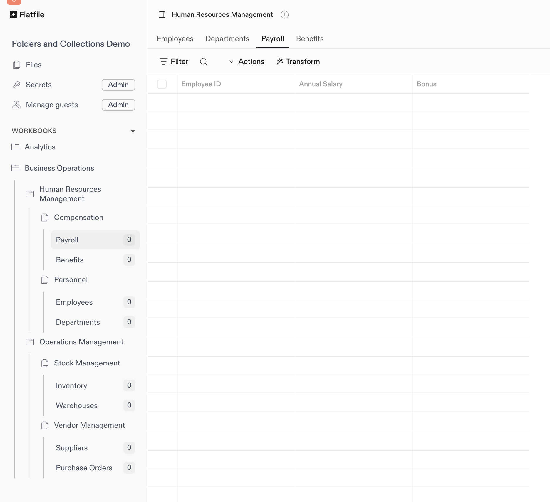 Although they have no impact on your data itself or its structure, Workbook Folders and Sheet Collections are a powerful way to organize your data in the Flatfile UI. They are essentially named labels that you assign to your Workbooks and Sheets, which the Flatfile UI interprets to group them together (and apart from others). You can define them directly in your Blueprint when configuring your Space or when otherwise creating or updating a Workbook or Sheet via the API. You can think of Folders and Collections like a filing system:- Folders help you organize your Workbooks within a Space (like organizing binders on a shelf).